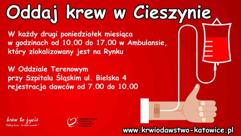 W każdy drugi poniedziałek miesiąca można oddać krew w godz. 10.00-17.00 w Ambulansie, który zlokalizowany jest na Rynku w Cieszynie.