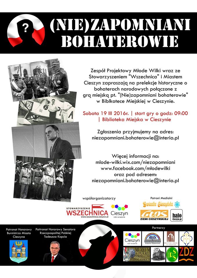 Czy znajomość polskich bohaterów narodowych w naszym społeczeństwie jest wystarczająca? Otóż w dobie cyfryzacji, komputeryzacji, przyspieszenia tempa życia zapominamy o tym, co kształtuje naszą tożsamość, a mianowicie o historii. Dlatego Zespół Projektowy Młode Wilki wraz ze Stowarzyszeniem „Wszechnica” i Miastem Cieszyn ma zaszczyt zaprosić Państwa na spotkanie z historią.