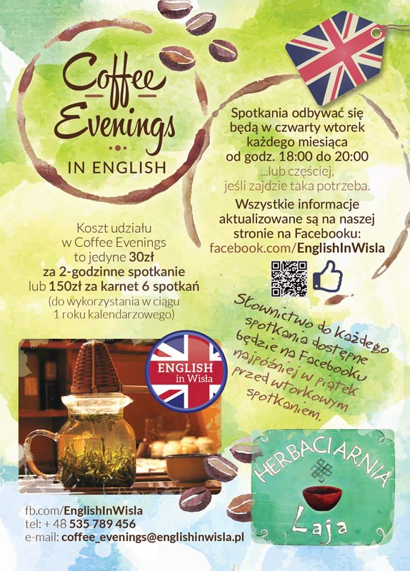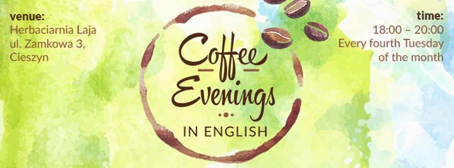 Spotkania w języku angielskim - Coffee Evenings in English! Wszystkich, pragnących swobodnie porozmawiać w języku angielskim na ciekawe tematy zapraszamy do Herbaciarni Laja w Cieszynie na Spotkania przy kawie lub herbacie…po angielsku! Spotkania odbywają się w czwarty wtorek każdego miesiąca.