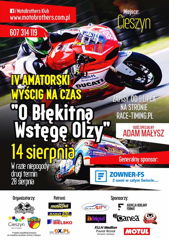 Miejski Ośrodek Sportu i Rekreacji w Cieszynie oraz Klub Motocyklowy MotoBrothers z Cieszyna uprzejmie informują, że w dniu 14 sierpnia br. Cieszyn gościł będzie uczestników IV edycji amatorskiego wyścigu motocyklowego na 400 metrów „O Błękitną Wstęgę Olzy 2016” będącego swego rodzaju reaktywacją odbywającego się na terenie Cieszyna w latach sześćdziesiątych ubiegłego wieku „Wyścigu Motocyklowego o Błękitną Wstęgę Olzy”, który obecnie organizowany jest przez MotoBrothers Klub z Cieszyna oraz Miejski Ośrodek Sportu i Rekreacji w Cieszynie.