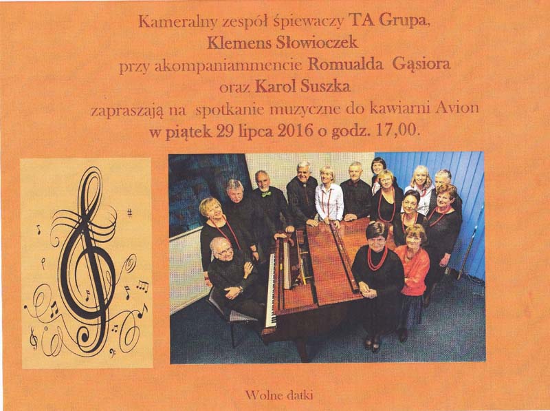 Kameralny zespół śpiewaczy Ta Grupa, Klemens Słowioczek przy akompaniamencie Romualda Gąsiora oraz Karol Suszka zapraszają na spotkanie muzyczne.