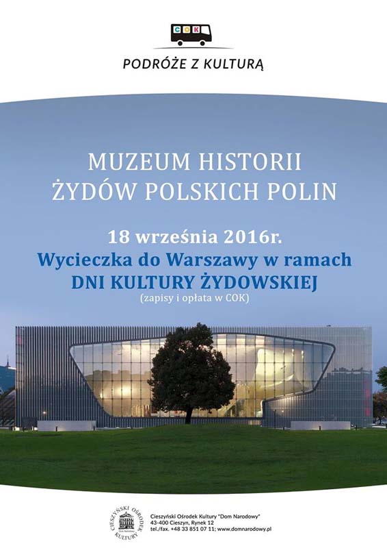 18 września o g. 5.00 – w cyklu „Podróże z kulturą” wycieczka do Warszawy, do „Muzeum Historii Żydów Polskich Polin” (ilość miejsc ograniczona, zapisy do 12 września w COK)