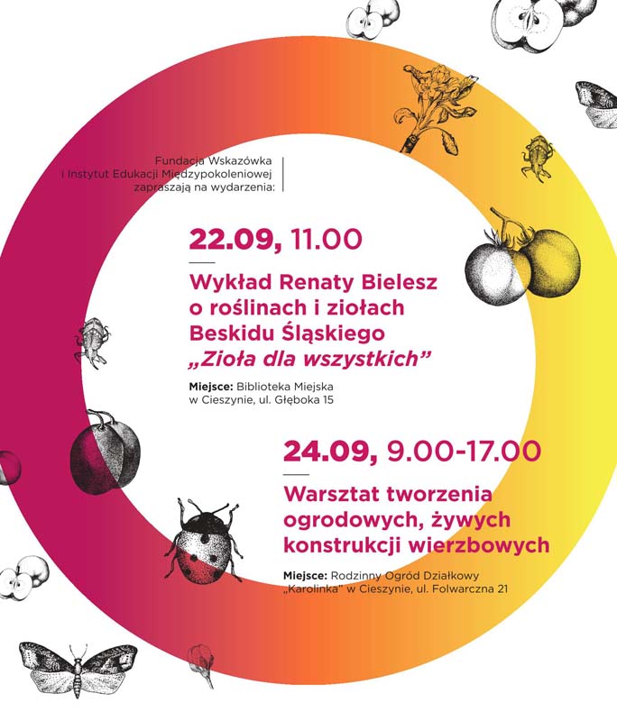 Wykład o roślinach i ziołach Beskidu Śląskiego pt. Zioła dla wszystkich, który wygłosi Renata Bielesz odbędzie się 22.09.2016 o godzinie 11.00 w Bibliotece Miejskiej w Cieszynie (sala wykładowa na ostatnim piętrze, ul. Głęboka 15). Na wykład obowiązują wcześniejsze zgłoszenia pod nr telefonu 515 261 827 lub e mailowo: fundacja.wskazowka@gmail.com.