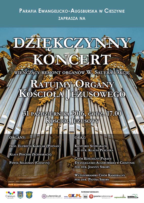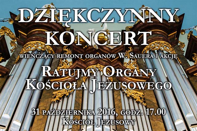 31 października 2016 r. o godz. 17.00 w Kościele Jezusowym odbędzie się Dziękczynny Koncert, podczas którego wystąpią znakomici organiści oraz chóry. Będzie to również okazja do podsumowania akcji „Ratujmy Organy Kościoła Jezusowego” i podziękowania wszystkim, dzięki którym Cieszyn znów będzie mógł się poszczycić wspaniałym koncertowym instrumentem.