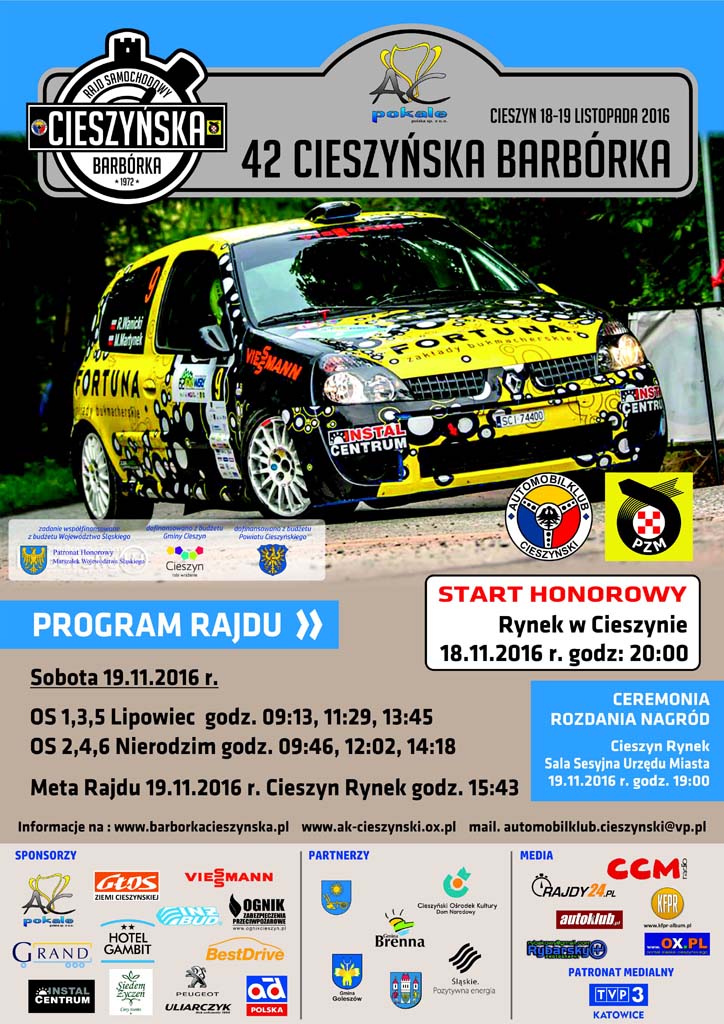 19 listopada 2016 roku odbędzie się 42 Rajd Cieszyńska Barbórka, ostatnia runda Rajdowych Samochodowych Mistrzostw Śląska.