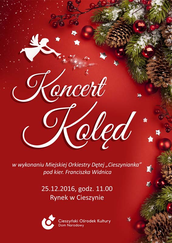 Jak co roku zapraszamy na Rynek, pod choinkę na koncert kolęd w wykonaniu Miejskiej Orkiestry Dętej „Cieszynianka” pod kier. Franciszka Widnica.
