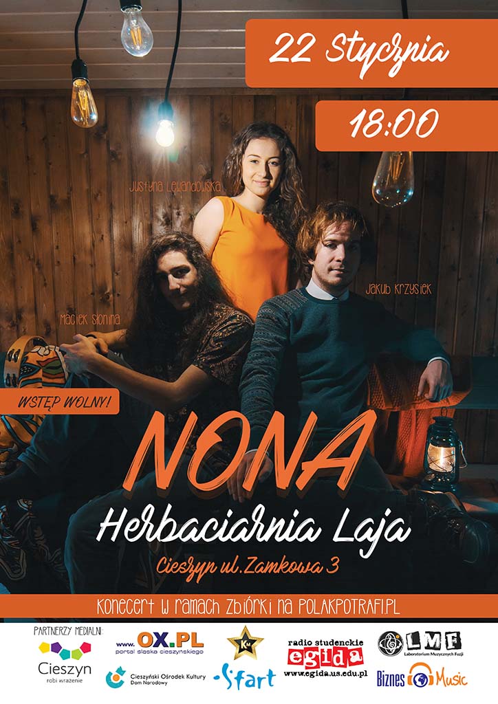 Zapraszamy na pierwszy koncert zespołu NONA. Odbędzie się on 22 stycznia 2017 r. w herbaciarni Laja w Cieszynie.