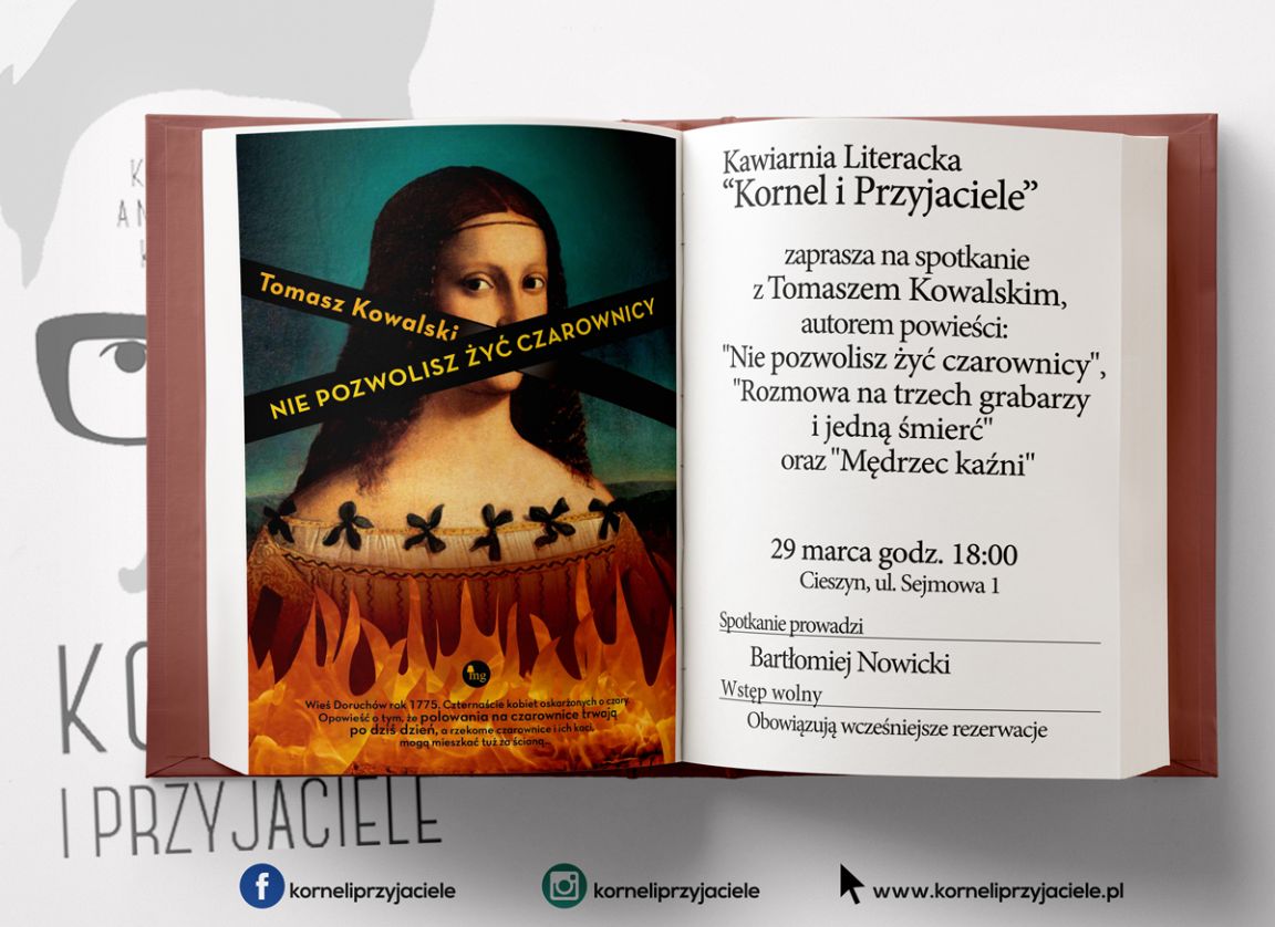 Kawiarnia Literacka "Kornel i Przyjaciele" zaprasza na spotkanie z Tomaszem Kowalskim, autorem powieści: "Rozmowa na trzech grabarzy i jedną śmierć", "Mędrzec kaźni" i najnowszej "Nie pozwolisz żyć czarownicy". Miłośnik makabry, czarnego humoru i turpizmu. Jego twórczość to często oswajanie śmierci przez śmiech. Nie unika przy tym tematów poważnych, fundamentalnych, jak sumienie, grzech, kara, miłosierdzie, wiara czy miłość. Najnowsza powieść autora "Nie pozwolisz żyć czarownicy" to opowieść oparta o szczątkowe informacje związane ze zdarzeniem z 1775 roku. We wsi Doruchów, tamtejszy dziedzic pojmał, poddał torturom, a na koniec spalił czternaście kobiet. Tomasz Kowalski parokrotnie odwiedził Doruchów w poszukiwaniu śladów tamtych wydarzeń, by przybliżyć czytelnikom ten zagadkowy epizod naszej historii.