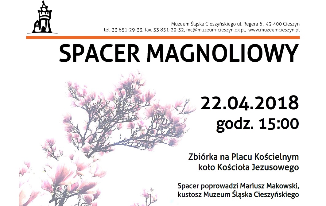 Muzeum Śląska Cieszyńskiego zaprasza na Spacer Magnoliowy 22 kwietnia 2018. Zbiórka o godzinie 15.00 na Placu Kościelnym koło Kościoła Jezusowego. Przewodnikiem będzie Mariusz Makowski, kustosz Muzeum Śląska Cieszyńskiego.