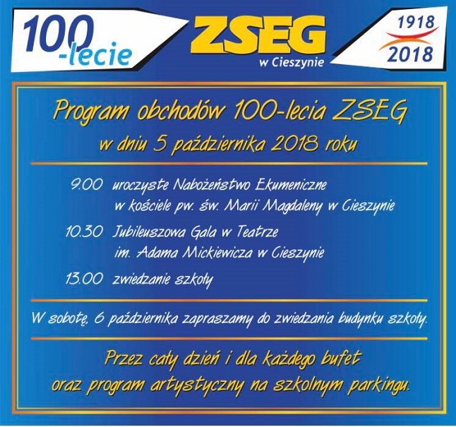 Zespół Szkół Ekonomiczno-Gastronomicznych w Cieszynie serdecznie zaprasza na obchody 100 Lecia szkoły.