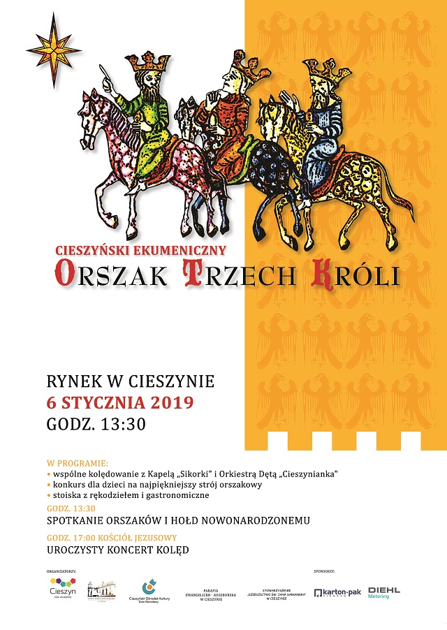 W niedzielę 6 stycznia 2019 roku zapraszamy na tradycyjny, Ekumeniczny Orszak Trzech Króli. W programie wydarzenia wspólne kolędowanie z Kapelą „Sikorki” i Orkiestrą Dętą”Cieszynianka”, konkurs dla dzieci na najpiękniejszy strój orszakowy oraz stoiska z rękodziełem i gastronomiczne. Wydarzenie rozpocznie się o godzinie 13.30 na cieszyńskim Rynku. Ostatnim punktem programu będzie uroczysty koncert kolęd, na który zapraszamy na godzinę 17.00 do Kościoła Jezusowego.