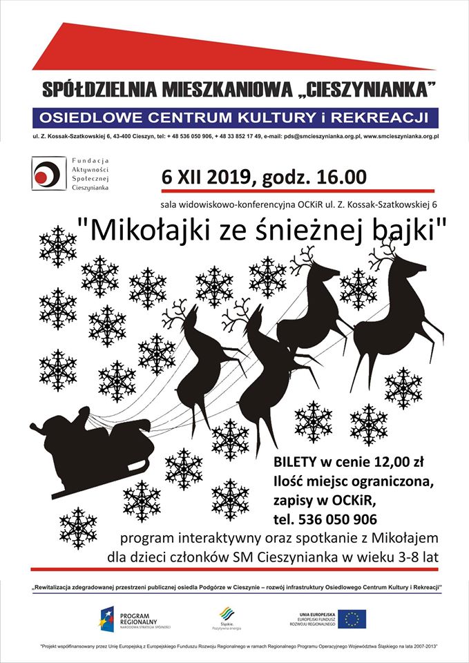 Zapraszamy wszystkie dzieci członków Spółdzielni Mieszkaniowej CIESZYNIANKA na spotkanie z Mikołajem oraz spektakl teatralny "Mikołajki ze śnieżnej bajki". Dla każdego dziecka prezent od Św. Mikołaja. Bilety w cenie 12 zł/dziecko. Zapisy w Osiedlowym Centrum Kultury Cieszynianka ul. Zofii Kossak-Szatkowskiej 6 Cieszyn w godzinach pracy biura.
