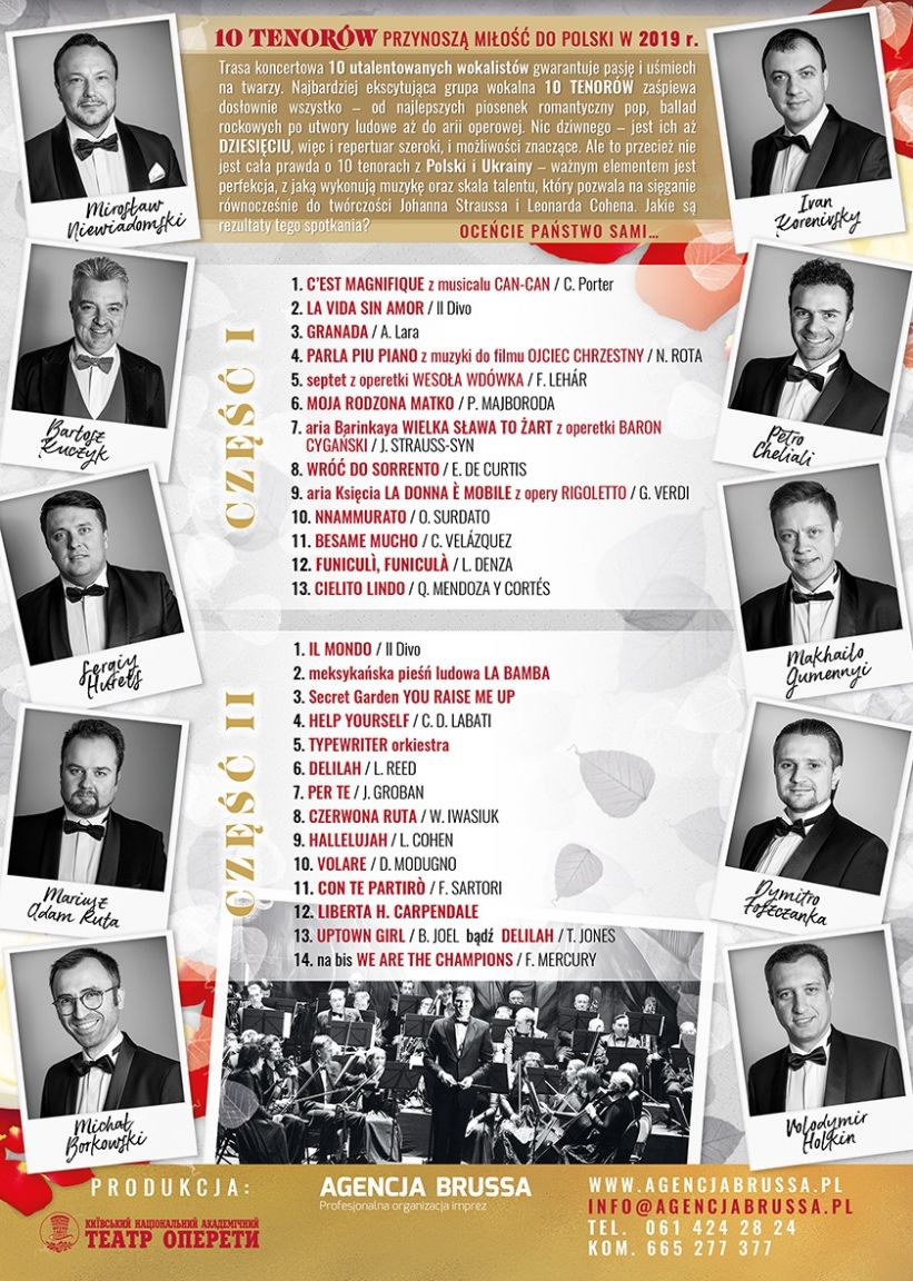 Trasa koncertowa 10 utalentowanych wokalistów gwarantuje pasję i uśmiech na twarzy. Najbardziej ekscytująca grupa wokalna 10 TENORÓW zaśpiewa dosłownie wszystko - od najlepszych piosenek romantyczny pop, ballad rockowych po utwory ludowe aż do arii operowej. Nic dziwnego - jest ich aż DZIESIĘCIU, więc i repertuar szeroki i możliwości znaczące. Ale to przecież nie jest cała prawda o 10 Tenorach z Polski i Ukrainy - ważnym elementem jest perfekcja z jaką wykonują muzykę, oraz skala talentu, który pozwala na sięganie równocześnie do twórczości Johanna Straussa i Leonarda Cohena. Jakie są rezultaty tego spotkania? Oceńcie Państwo sami...