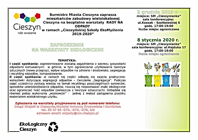 Burmistrz Miasta Cieszyna zaprasza mieszkańców zabudowy wielolokalowej Cieszyna na bezpłatne warsztaty „RADY NA ODPADY” organizowane w ramach „Cieszyńskiej Szkoły EkoMyślenia 2019-2020”, które odbędą się 2 grudnia i 8 stycznia.