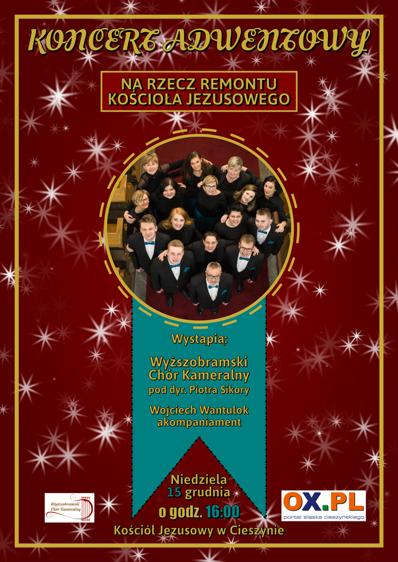 Wyższobramski Chór Kameralny działający przy cieszyńskiej parafii ewangelickiej zaprasza na doroczny koncert adwentowy, który odbędzie się w niedzielę, 15 grudnia o godz. 16.00 w Kościele Jezusowym. Chór pod dyr. Piotra Sikory wykona nastrojowe pieśni i kolędy. Na finał zabrzmi „Kantata na Boże Narodzenie” Sally DeFord na chór, solistów i fortepian, przy którym zasiądzie Wojciech Wantulok. Wystąpią również goście. Wstęp wolny. Podczas koncertu będzie można złożyć ofiarę na cel remontu Kościoła Jezusowego. Prace konserwatorskie rozpoczęły się w 2018 r. i potrwają do 2021 r. Wkład własny parafii do projektu wynosi 3 miliony złotych. Koncert adwentowy jest cegiełką w tym ogromnym przedsięwzięciu. Serdecznie zapraszamy!