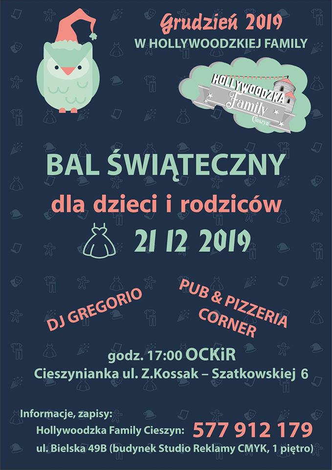 Wielki Bal Świąteczny dla dzieci i rodziców. Dużo dobrej zabawy przy muzyce z DJ GREGORIO. Zapraszamy 21.12.2019 na godz. 17.00 do OCKiR w Cieszynie, ul. Z. Kossak-Szatkowskiej 6. Zapisy pod nr tel. 577-912-179 lub w Hollywoodzkiej Family Cieszyn ul. Bielska 49 b (budynek Studio Reklamy CMYK, 1 piętro).