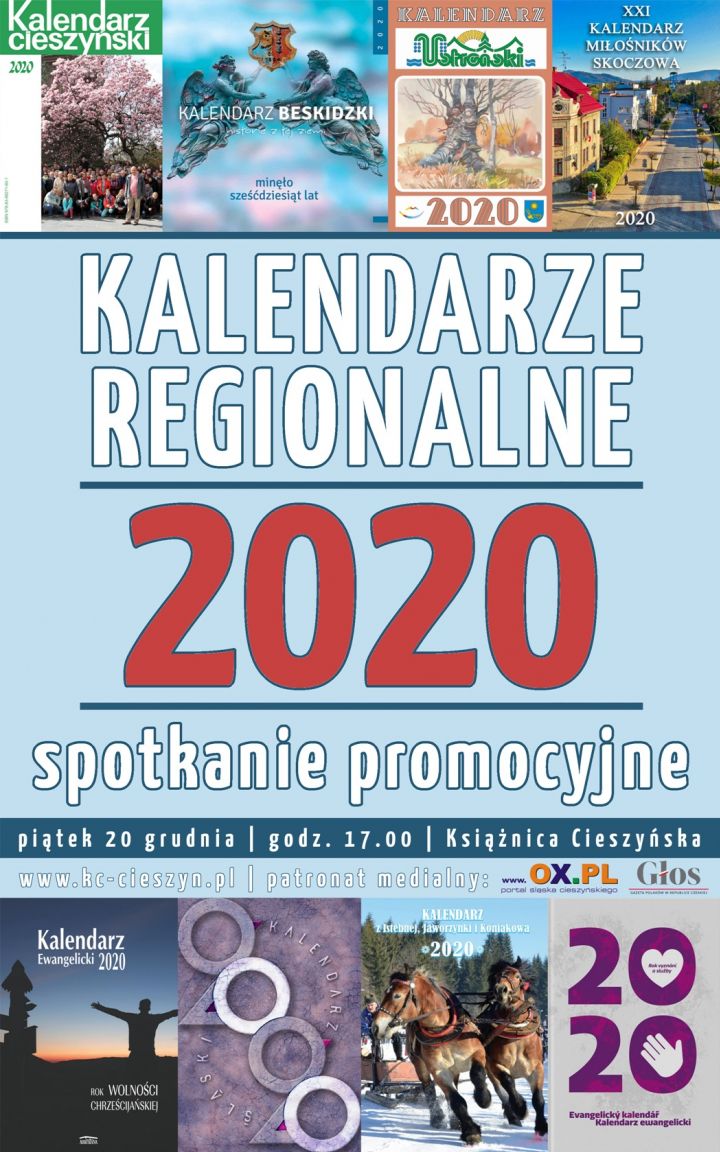W piątek 20 grudnia o godz. 17.00 w sali konferencyjnej Książnicy Cieszyńskiej odbędzie się spotkanie promocyjne poświęcone regionalnym kalendarzom na rok 2020. Zaprezentowanych zostanie łącznie dziewięć wydawnictw, o których będą mówić ich redaktorzy: Monika Niemiec (Kalendarz Ustroński), Angelika Ogrocka (Kalendarz Miłośników Skoczowa), ks. Jerzy Below (Kalendarz Ewangelicki), ks. Janusz Kożusznik (Kalendarz Ewangelicki – Evangelick kalend), Tomasz Lenkiewicz (Kalendarz Goleszowski), Józef Michałek (Kalendarz z Istebnej, Jaworzynki i Koniakowa), Jan Picheta (Kalendarz Beskidzki), Marian Siedlaczek (Kalendarz Śląski) oraz Wojciech Święs (Kalendarz Cieszyński). Uczestnicy spotkania będą mieli okazję nabyć te z omawianych tytułów, które już ukazały się drukiem.