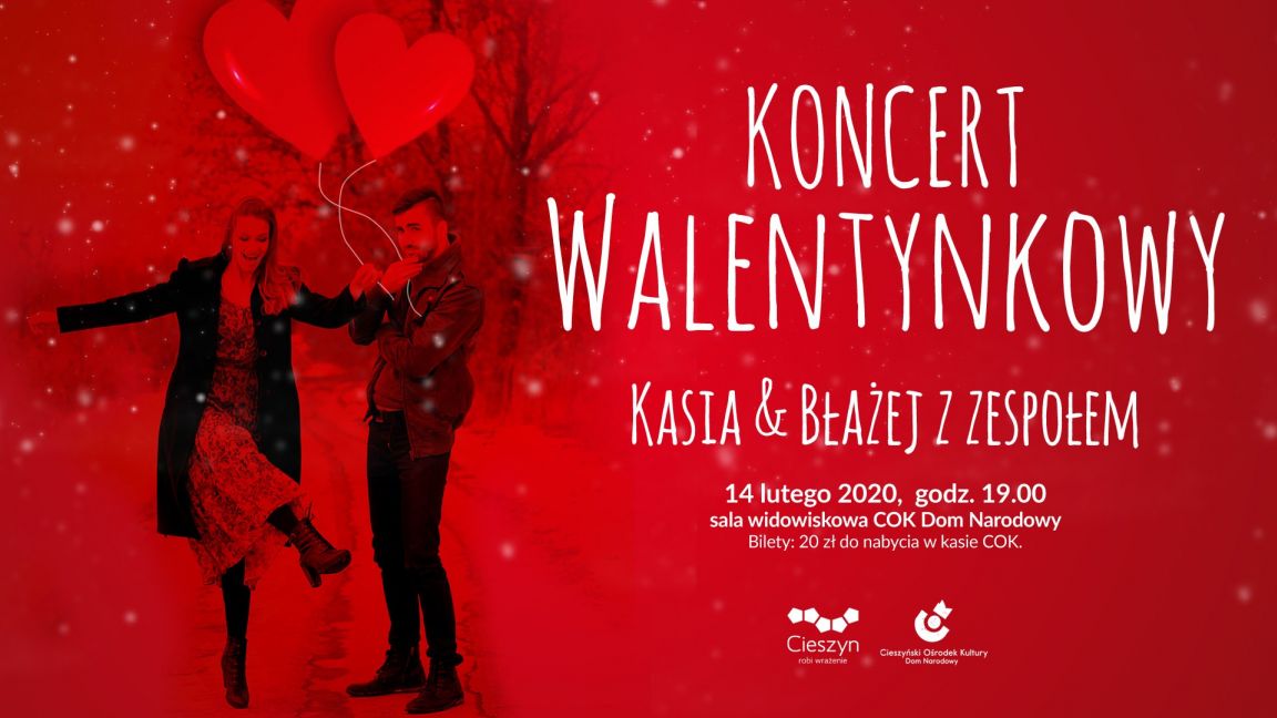 Drogie Panie, Szanowni Panowie, czas pomyśleć o zaplanowaniu czasu, który poświęcicie swoim drugim połówkom w dzień zakochanych! Walentynki już niedługo! Cieszyński Ośrodek Kultury "Dom Narodowy" - COK z tej okazji ma Wam do zaproponowania specjalny koncert walentynkowy w wykonaniu duetu Kasia & Błażej w towarzyszeniu zawodowego zespołu!