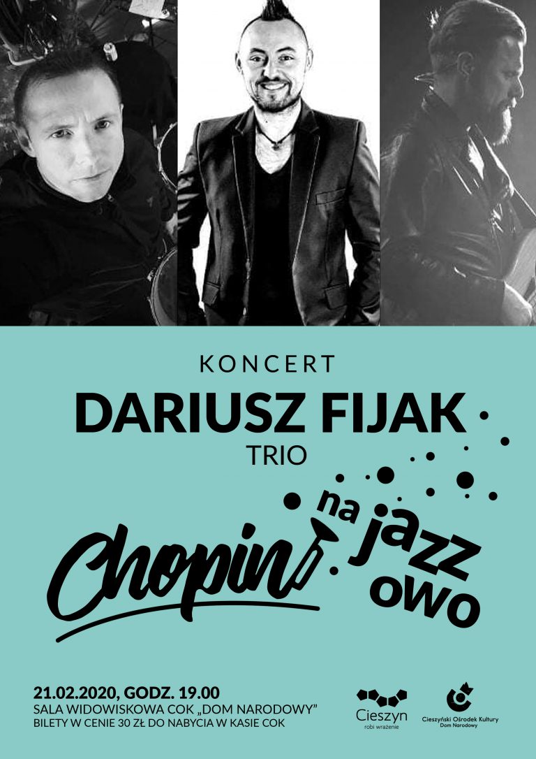 Cieszyński Ośrodek Kultury „Dom Narodowy” zaprasza na koncert formacji Dariusz Fijak Trio w programie „Chopin na jazzowo”. Koncert odbędzie się w piątek 21 lutego o godzinie 19.00 w sali widowiskowej Domu Narodowego w Cieszynie. Bilety w cenie 30 zł dostępne do nabycia w kasie COK na parterze Domu Narodowego.