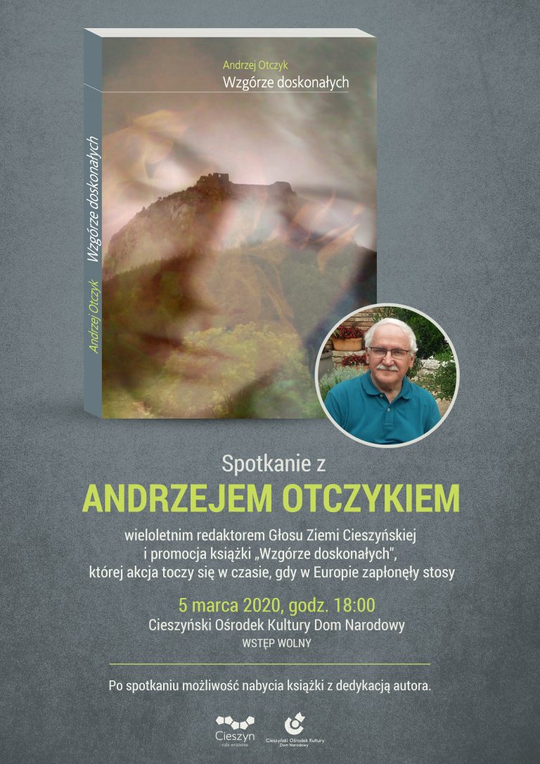 Cieszyński Ośrodek Kultury „Dom Narodowy” zaprasza na spotkanie z Andrzejem Otczykiem, wieloletnim redaktorem Głosu Ziemi Cieszyńskiej. Spotkanie odbędzie się w związku z promocją książki „Wzgórze doskonałych”, której akcja toczy się w czasie, gdy w Europie zapłonęły stosy. Zapraszamy w czwartek 5 marca 2020 o godzinie 18.00. Wydarzenie będzie miało miejsce w Sali Widowiskowej Domu Narodowego.