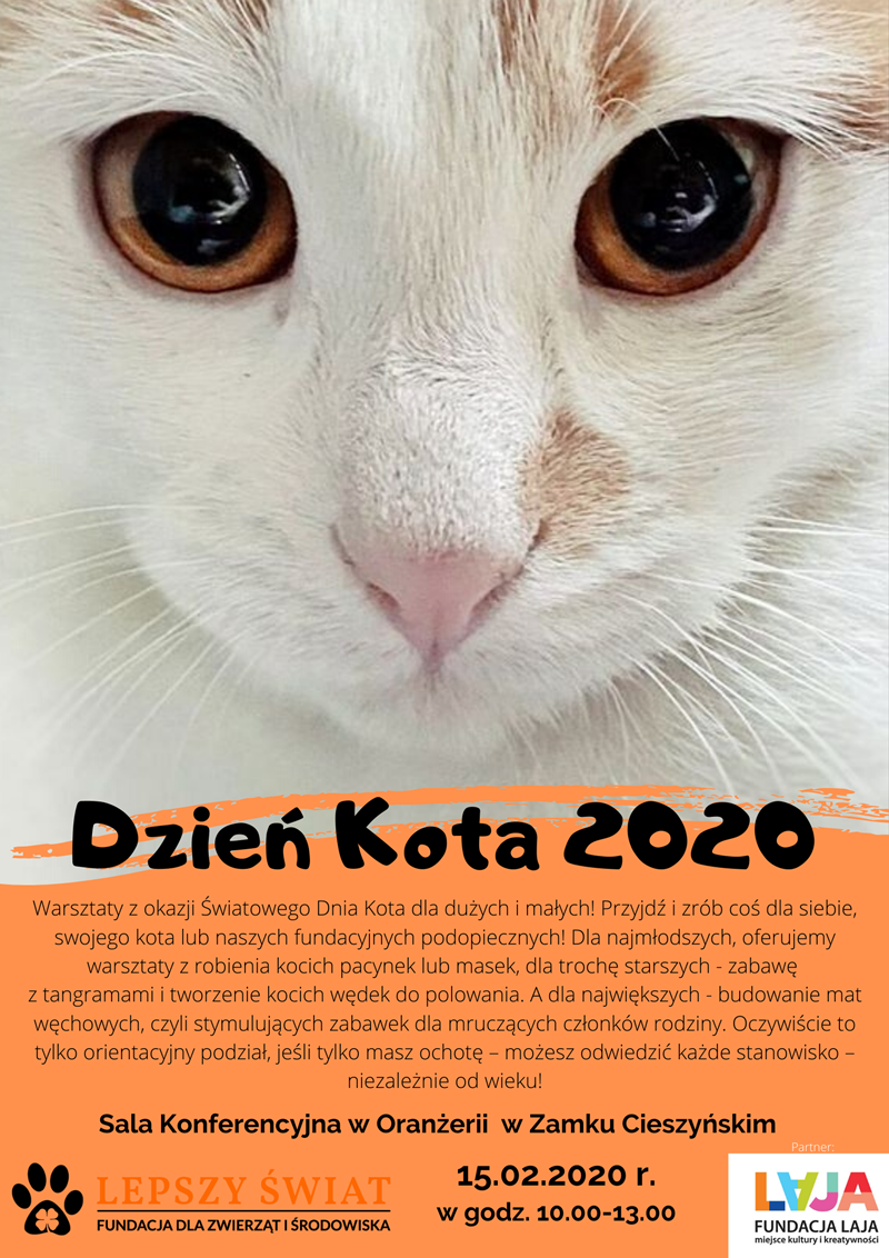 Fundacja dla Zwierząt i Środowiska „Lepszy Świat”, zaprasza wszystkich mieszkańców Cieszyna (i okolic) na wspólne obchody Światowego Dnia Kota! Już 15.02.2020 r. w godz. 10.00-13.00 w Sali Konferencyjnej w budynku Oranżerii Zamku Cieszyn odbędą się warsztaty dla Dużych i Małych.