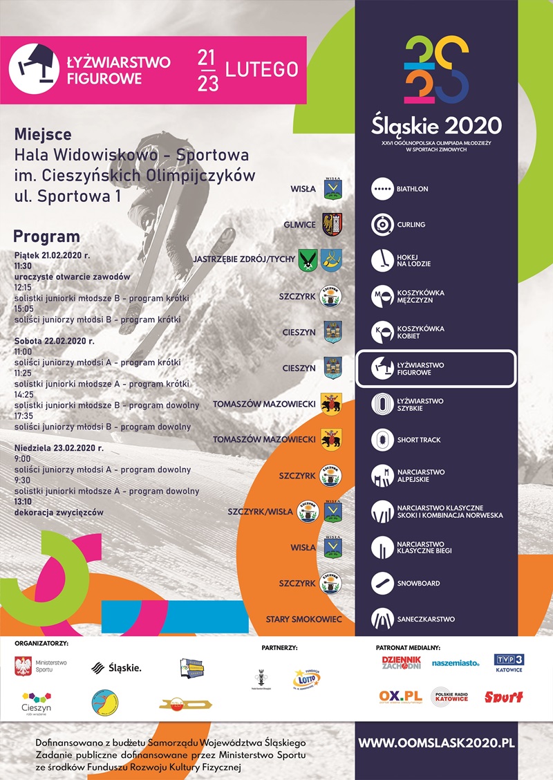 W Cieszynie będziemy mieli przyjemność śledzić rywalizacje o medale w dwóch dyscyplinach. Najpierw w dniach 21-23 lutego na Hali Widowiskowo-Sportowej im. Cieszyńskich Olimpijczyków przy ul. Sportowej 1, odbędą się Finały XXVI Ogólnopolskiej Olimpiady Młodzieży w sportach zimowych „Śląskie-2020” w łyżwiarstwie figurowym. Przez trzy dni juniorzy i juniorki będą prezentowali się w programach dowolnych i krótkich. Z pewnością będzie to wyjątkowe i warte obejrzenia widowisko, dlatego też zachęcamy gorąco, aby odwiedzić w tych dniach cieszyńskie lodowisko i z trybun podziwiać zmagania łyżwiarzy i łyżwiarek z całej Polski. Wstęp na imprezę jest bezpłatny.