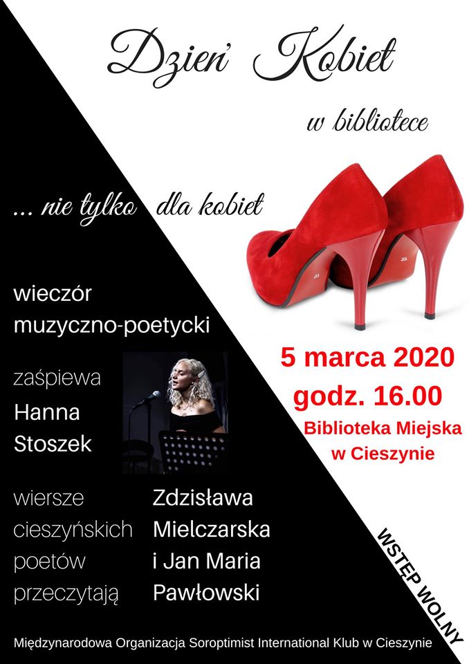 5 marca 2020 r. o godz. 16.00 Dzień Kobiet świętować będziemy w Bibliotece Miejskiej w Cieszynie wspólnie z Soroptimist International Klub w Cieszynie już po raz czwarty. Tematem spotkania będą oczywiście kobiety, ale panowie są równie mile widziani. Tym razem w programie znajdzie się piosenka poetycka w wykonaniu Hanny Stoszek – młodej wokalistki o niezwykłym głosie oraz wiersze cieszyńskich poetów w interpretacji Zdzisławy Mielczarskiej i Jana Marii Pawłowskiego. Mamy nadzieję, że zechcą Państwo spędzić z nami miłe popołudnie przy kawie, dobrej muzyce i poezji. Wstęp jest bezpłatny.