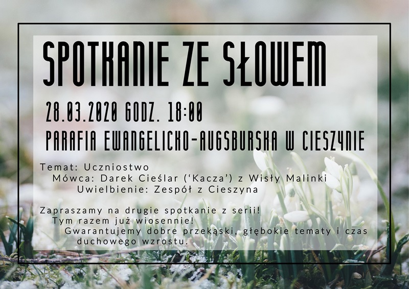 Zapraszamy wszystkich na kolejne Spotkanie ze Słowem, które odbędzie się w sobotę 28 marca o godzinie 18:00. Tym razem naszym tematem przewodnim będzie uczniostwo, o którym opowie Darek Cieślar z Wisły Malinki. Jeśli oglądaliście kiedyś filmiki na kanale niewiemcomyslec (youtube) to znaczy, że już widzieliście naszego gościa :) Uwielbienie po raz kolejny poprowadzi zespół z Cieszyna. My już nie możemy się doczekać, będzie super! Do zobaczenia.