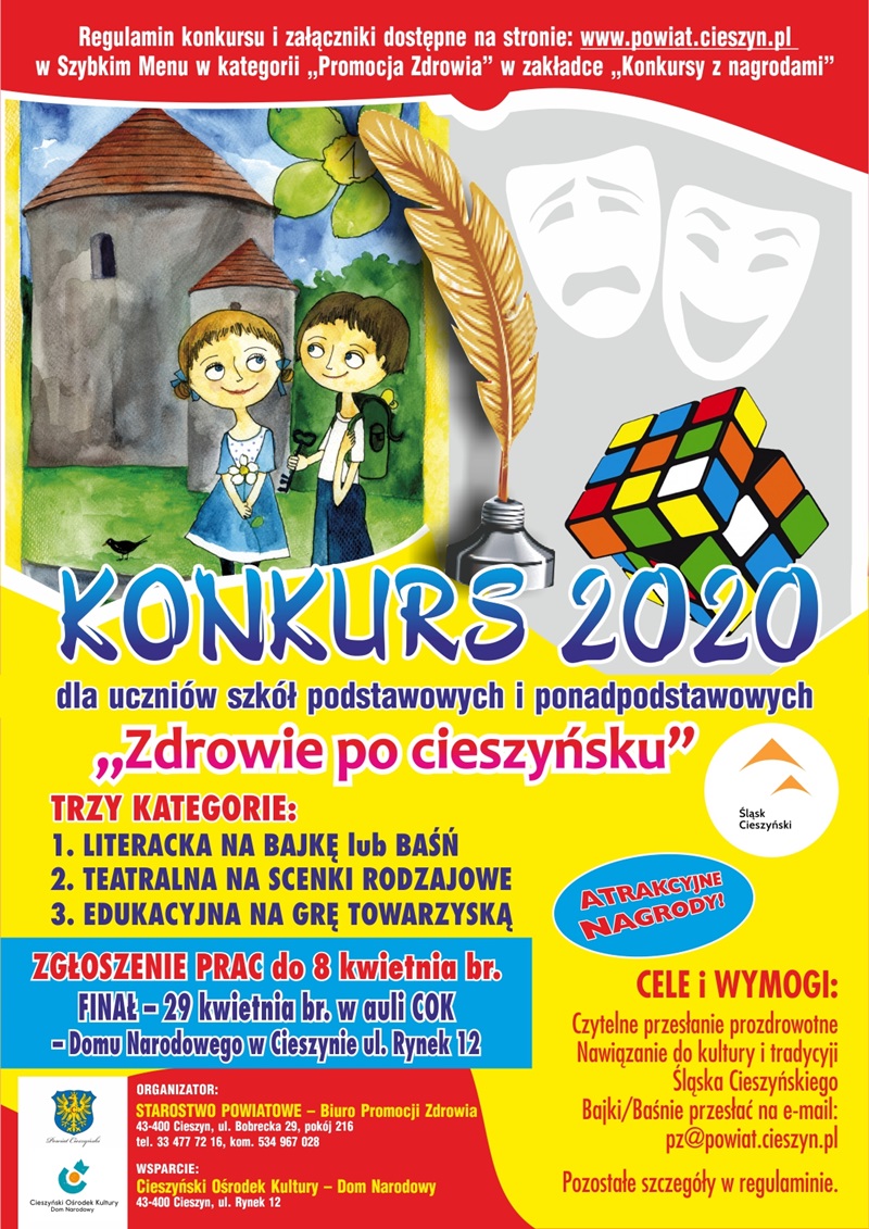 Serdecznie zapraszamy uczniów i nauczycieli do udziału w nowej edycji konkursu, który propaguje zdrowy styl życia, w połączeniu z kulturą i tradycją Śląska Cieszyńskiego. Do wyboru są trzy kategorie: literacka na bajkę lub baśń, teatralna na scenkę rodzajową oraz edukacyjna na grę towarzyską. Zgłoszenia przyjmujemy do dnia 8 kwietnia br. Finał konkursu odbędzie się 29 kwietnia 2020r. o godz. 10.00 w auli Cieszyńskiego Ośrodka Kultury Domu Narodowego.