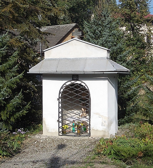 Opis: Widok kapliczki od ul. Frysztackiej. Kapliczka znajduje się obok budynku o adresie Frysztacka nr 60 (przy mostku) na działce nr 138/6 obr. 68