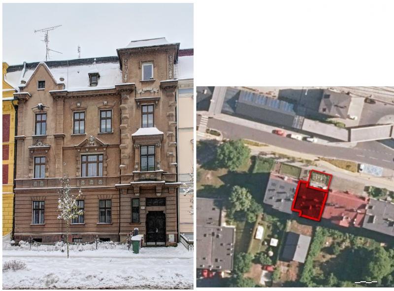 Opis: Widok kamienicy od strony północnej. Mapa z naniesioną lokalizacją kamienicy i odcinkiem historycznego ogrodzenia
