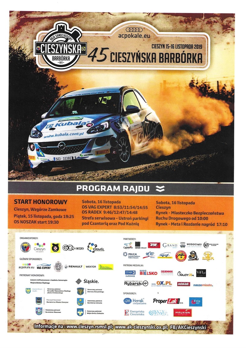 Cieszyńska Barbórka zakończy sezon 2019 w Rajdowych Samochodowych Mistrzostwach Śląska. Impreza zaplanowana na 15 i 16 listopada będzie także 6 rundą Rajdowego Samochodowego Pucharu Śląska Super KJS, więc kibice sportów motorowych mogą spodziewać się ponad stu załóg, które będą się ścigać w tych zawodach.