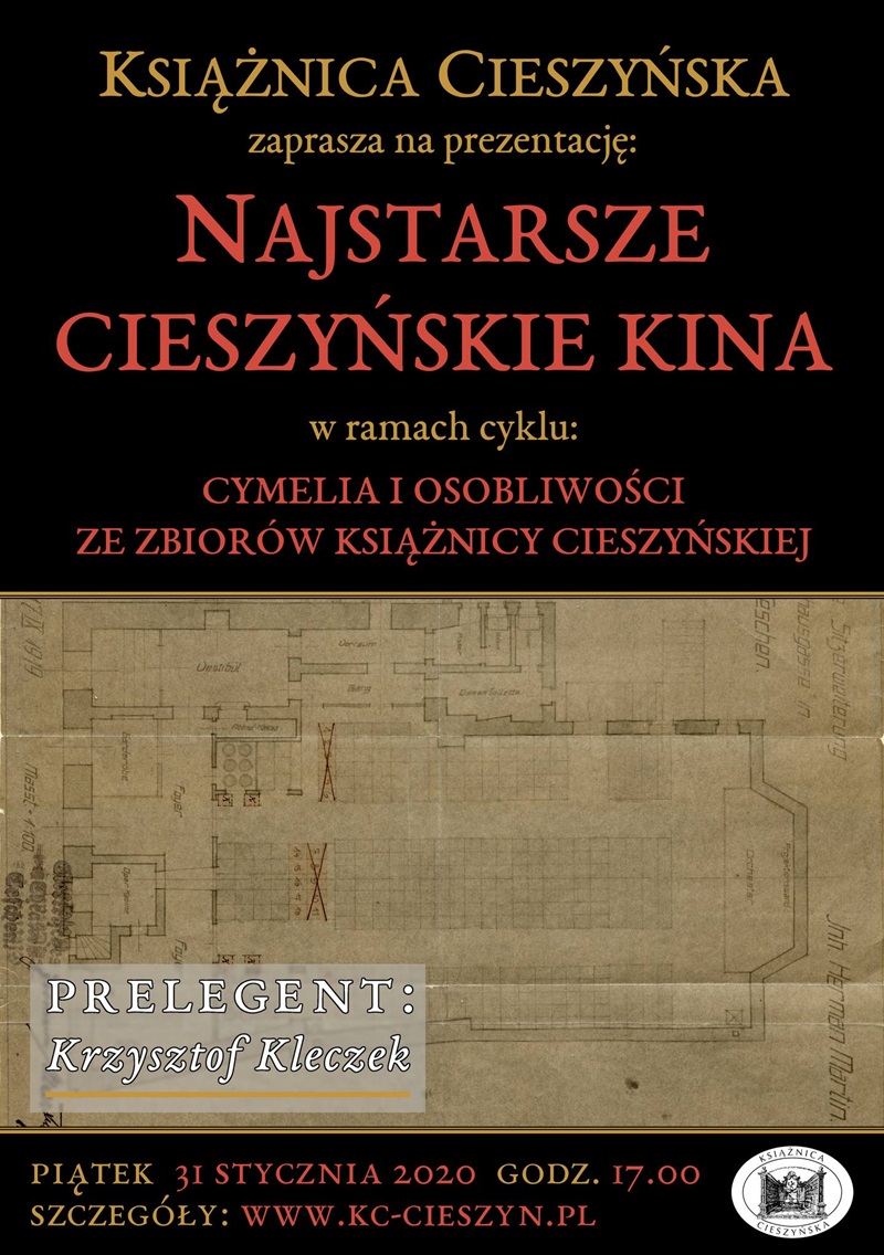 W ostatni piątek miesiąca (31 stycznia 2020 r.) odbędzie się spotkanie inaugurujące tegoroczny cykl „Cymelia i osobliwości ze zbiorów Książnicy Cieszyńskiej”. Prezentacja będzie miała miejsce w sali konferencyjnej Książnicy Cieszyńskiej. Asumptem do przedstawienia zagadnienia najstarszych cieszyńskich kin jest pochodzący z 1919 r. plan miejskiego kina Hermana Martina, które mieściło się w sali dawnego browaru.