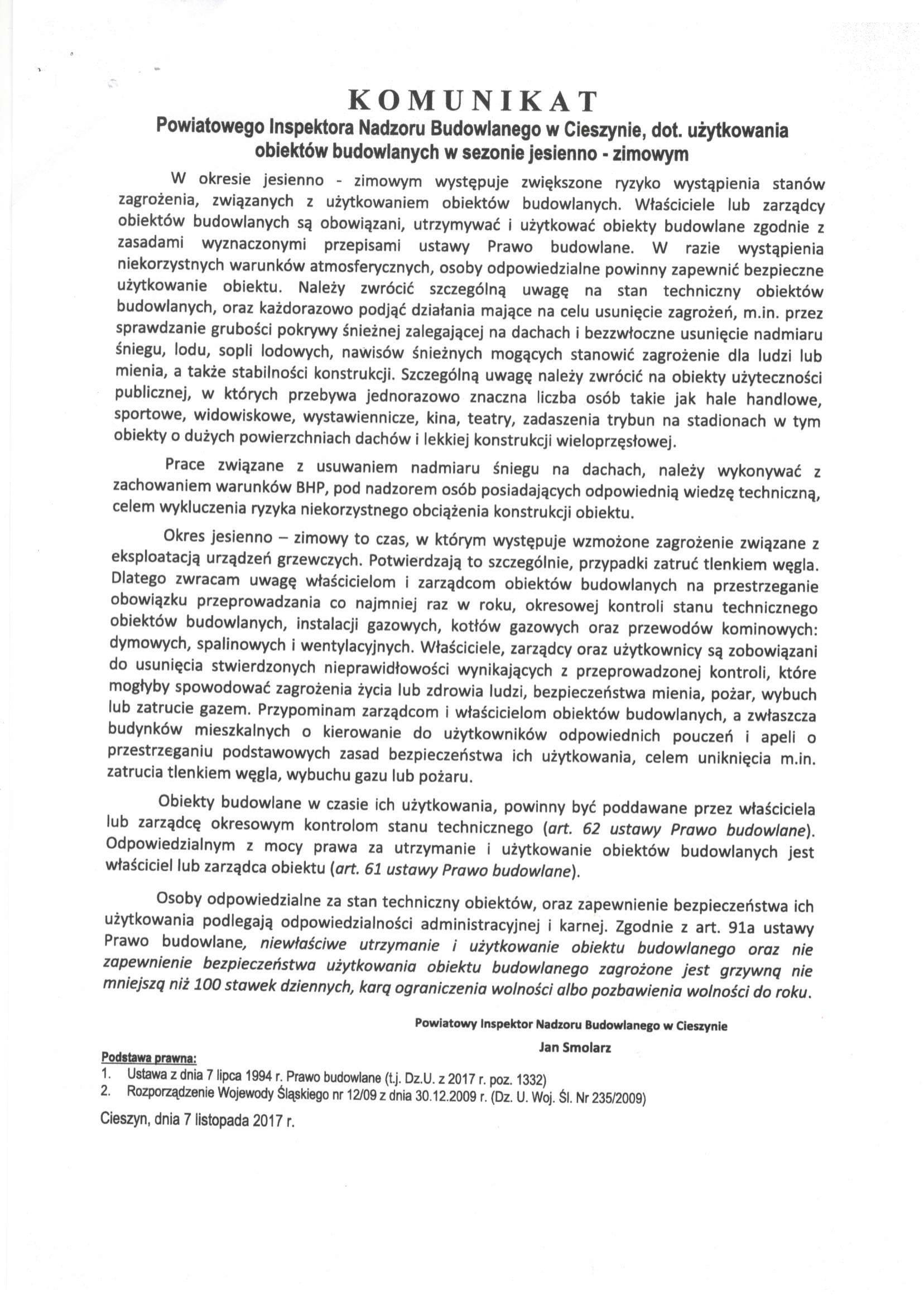 Na podstawie Komunikatu Powiatowego Inspektora Nadzoru Budowlanego w Cieszynie z dnia 7 listopada 2017 r., dot. użytkowania obiektów budowlanych w sezonie jesienno - zimowym, przypominamy o obowiązkach ciążących na właścicielach lub zarządcach obiektów budowlanych w zakresie ich utrzymywania i użytkowania, wynikających w szczególności z art. 61 i następnych ustawy Prawo Budowlane. W razie wystąpienia niekorzystnych warunków atmosferycznych, osoby odpowiedzialne powinny zapewnić bezpieczne użytkowanie obiektu. Należy zwrócić szczególną uwagę na stan techniczny obiektów budowlanych oraz każdorazowo podjąć działania mające na celu usunięcie zagrożeń, m.in. przez sprawdzanie grubości pokrywy śnieżnej zalegającej na dachach i bezzwłoczne usunięcie nadmiaru śniegu, lodu, sopli lodowych, nawisów śnieżnych mogących stanowić zagrożenie dla ludzi lub mienia, a także stabilności konstrukcji.