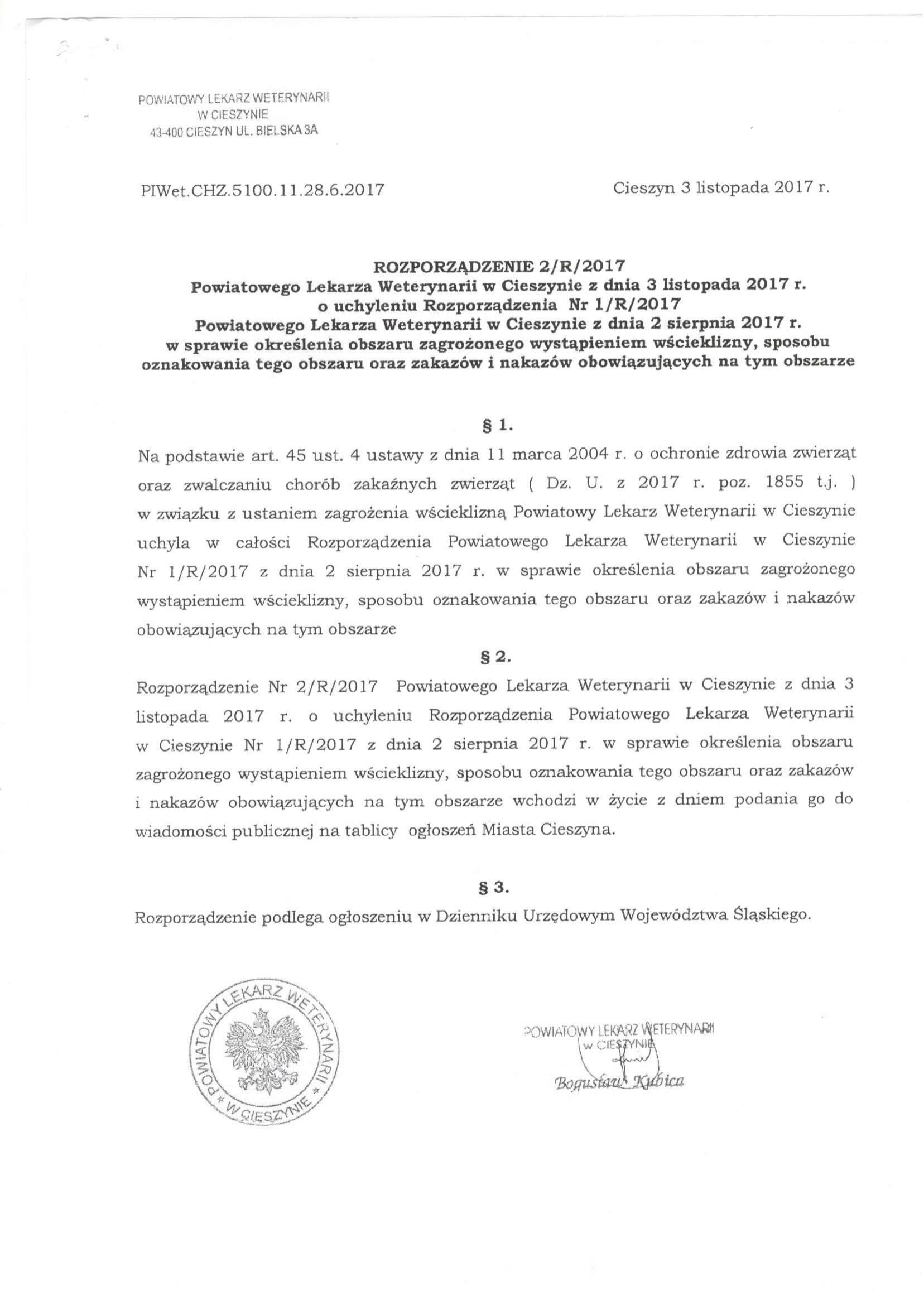 Informujemy, iż w związku z ustaniem zagrożenia wścieklizną, Powiatowy Lekarz Weterynarii w Cieszynie uchyla w całości Rozporządzenie Nr 1/R/2017 Powiatowego Lekarza Weterynarii w Cieszynie z dnia 2 sierpnia 2017 r. w sprawie określenia obszaru zagrożonego wystąpieniem wścieklizny, sposobu oznakowania tego obszaru oraz zakazów i nakazów obowiązujących na tym obszarze.