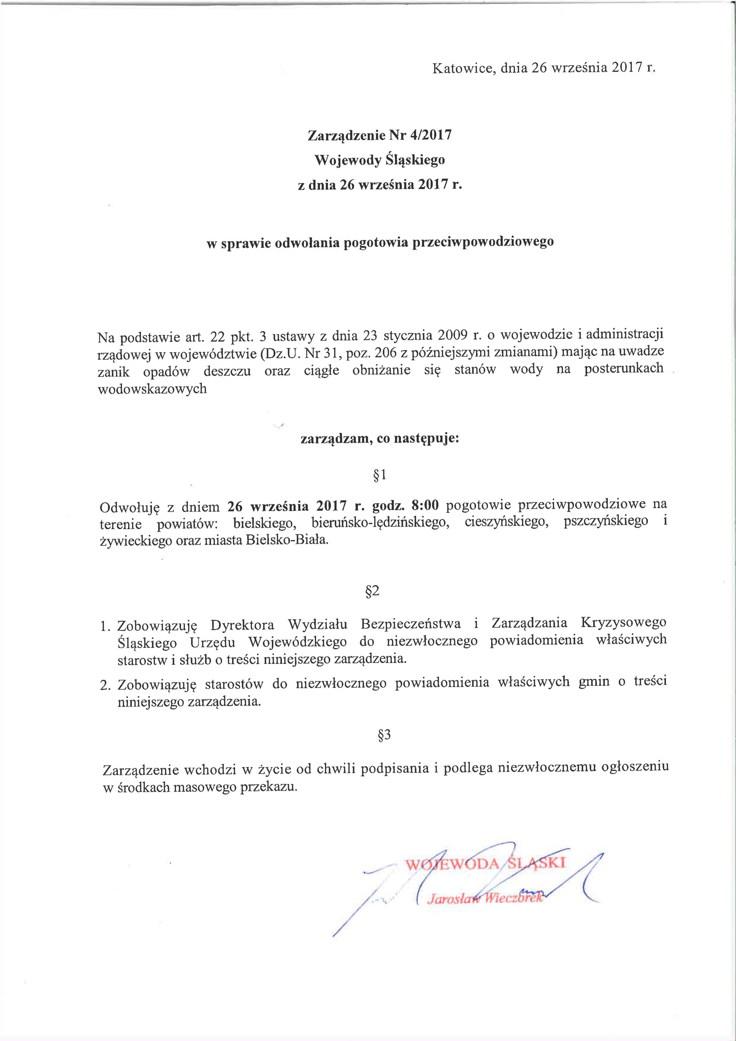 Informujemy, że Wojewoda Ślaski z dniem 26.09.2017 r. godz. 8:00 odwołał pogotowie przeciwpowodziowe na terenie powiatu cieszyńskiego.