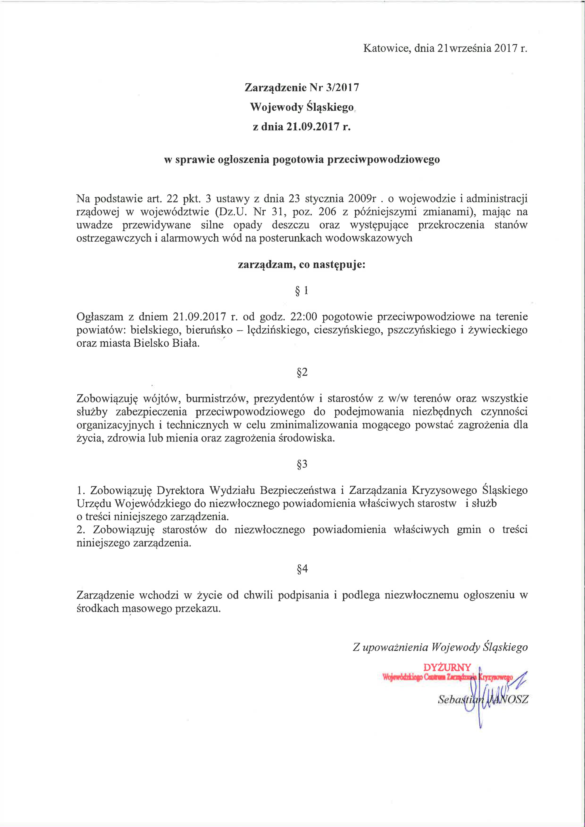 Wojewoda Ślaski z dniem 21.09.2017 r. od godz. 22:00 ogłosił pogotowie przeciwpowodziowe na terenie powiatów: bielskiego, bieruńsko-lędzińskiego, cieszyńskiego, pszczyńskiego i żywieckiego oraz miasta Bielsko-Biała.