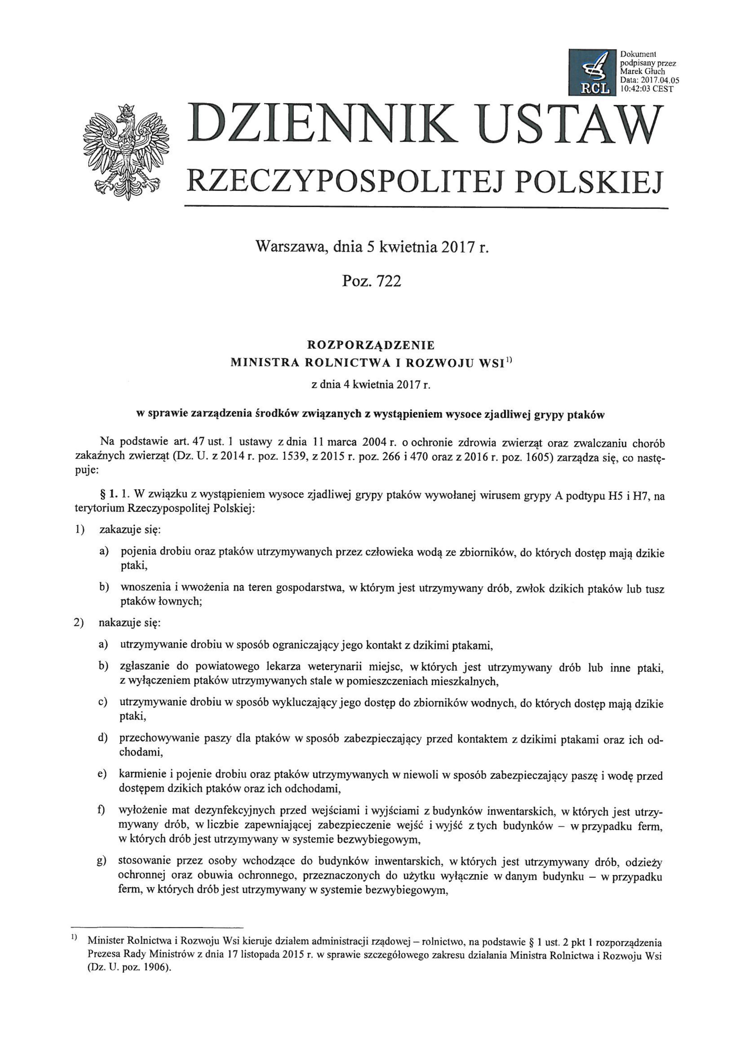 Zachęcamy do zapoznania się z Rozporządzeniem Ministra Rolnictwa i Rozwoju Wsi z dnia 4 kwietnia 2017 r. w sprawie zarządzenia środków związanych z wystąpieniem wysoce zjadliwej grypy ptaków.