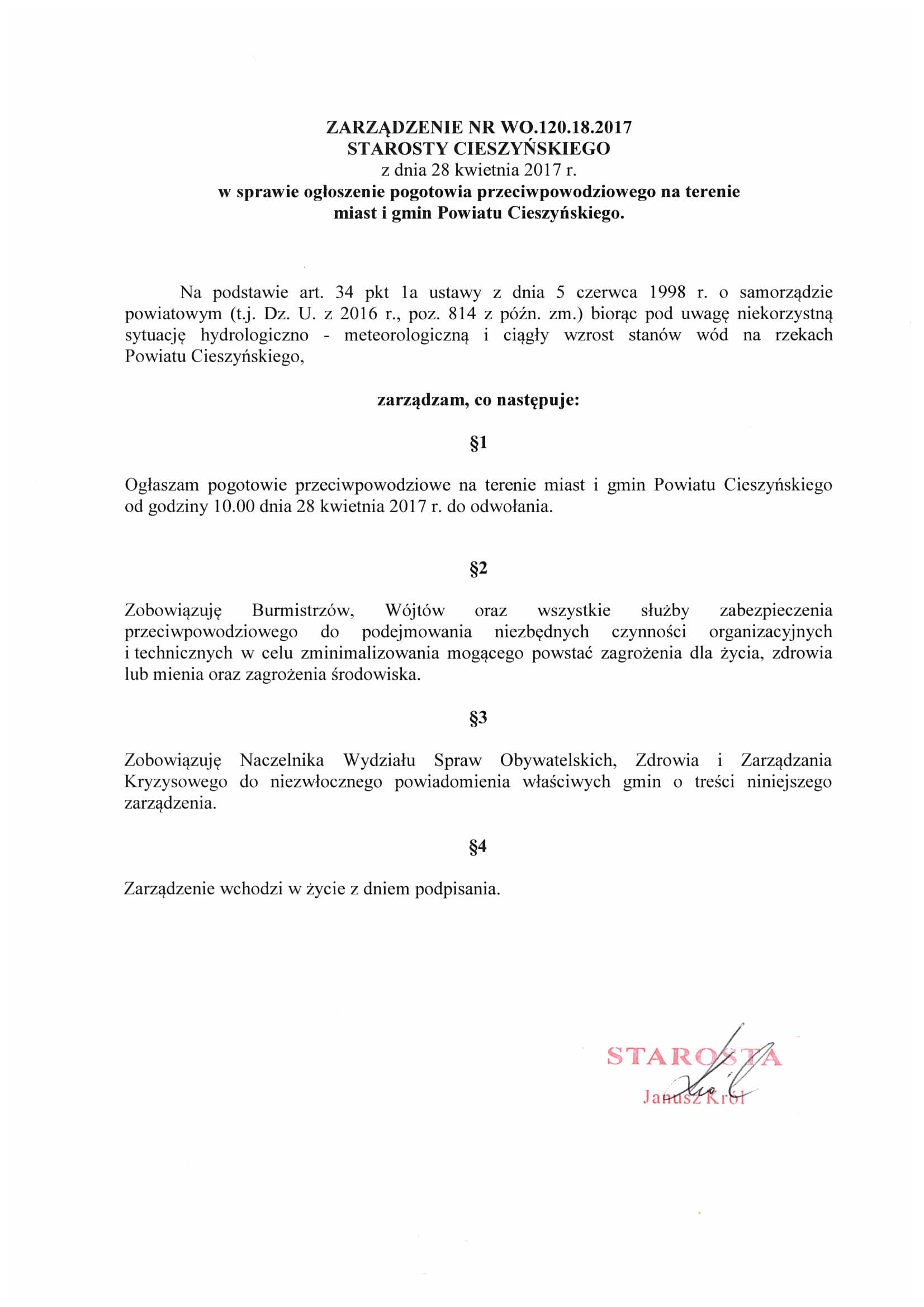 Prosimy o zapoznanie się z Zarządzeniem Nr WO.120.18.2017 Starosty Cieszyńskiego z dnia 28 kwietnia 2017 r. w sprawie ogłoszenia pogotowia przeciwpowodziowego na terenie miast i gmin Powiatu Cieszyńskiego od godziny 10.00 28 kwietnia 2017 r. do odwołania.