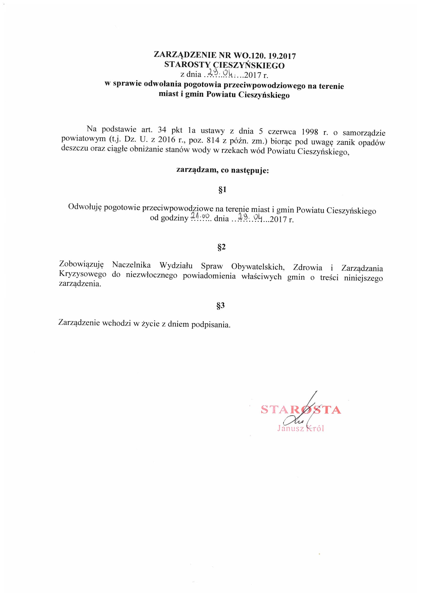 Zarządzenie - odwołanie pogotowia przeciwpowodziowego