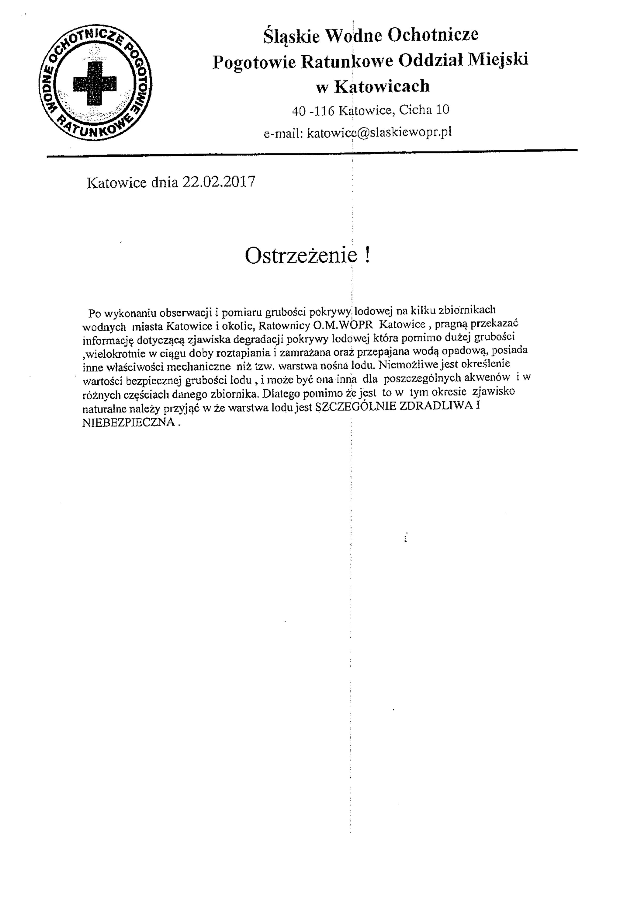 Ostrzeżenie Śląskiego Wodnego Ochotniczego Pogotowia Ratunkowego Oddział Miejski w Katowicach dotyczące roztopów pokrywy lodowej.